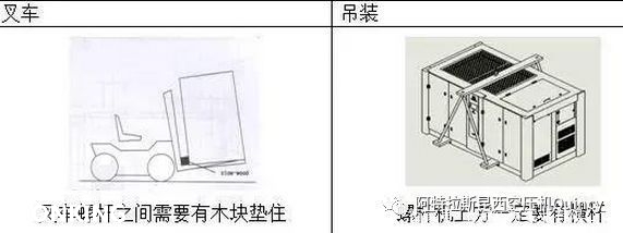昆西空壓機在安裝前需要放置在指定位置,在運輸放置過程中可以使用叉車或者吊裝的方式進行運輸放置,但是需要注意操作方式需按下圖展示要求進行。