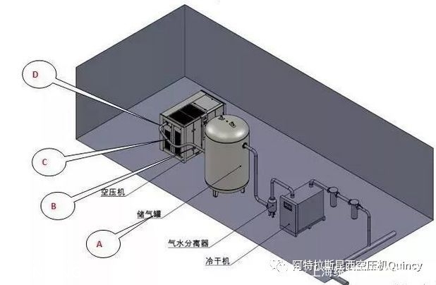 A)配套設備安裝順序要求如圖,“空壓機→儲氣罐→氣水分離器→冷干機”的安裝順序能有效利用氣體流動特性提前排出水分降低冷干機負荷。