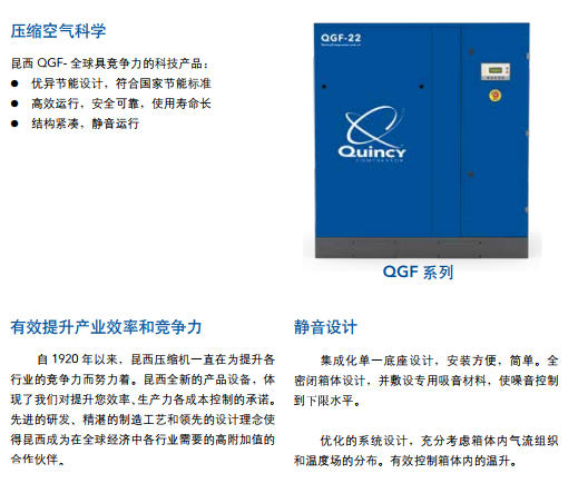 如果您正在尋找高效的昆西空壓機(jī)配套設(shè)備,昆西空壓機(jī) QUINCY 可以滿足您的需求.擁有先進(jìn)的旋轉(zhuǎn)螺桿空氣壓縮機(jī)技術(shù),昆西空壓機(jī)作為可靠的壓縮空氣來源,適用于各種工業(yè)應(yīng)用.昆西空壓機(jī)的低成本和高可靠性將對(duì)您公司的生產(chǎn)成本產(chǎn)生積極的影響!